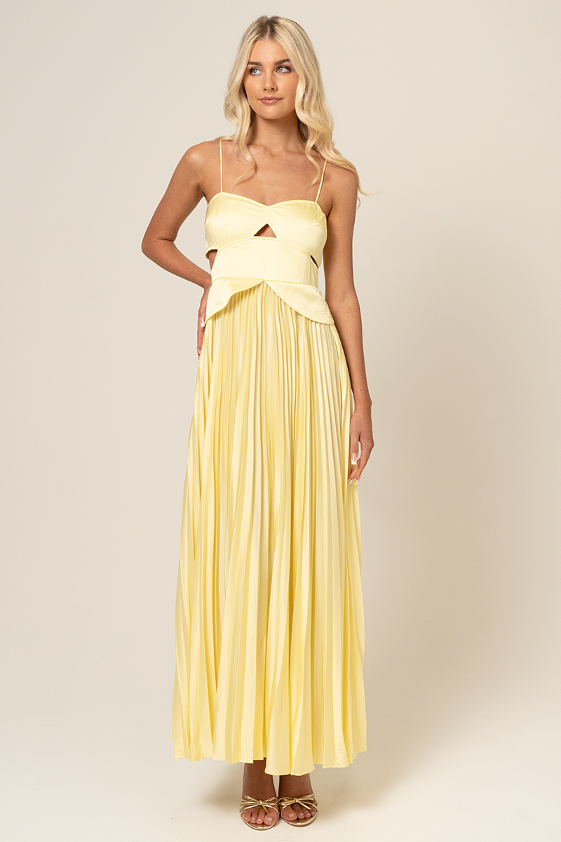 Introducing our enchanting Dress. a timeless masterpiece that seamlessly combines vintage charm with modern elegance. This maxi dress features a stunning yellow hue that radiates warmth while the pleated skirt cascades gracefully down. creating a sense of movement that is both captivating and flattering.