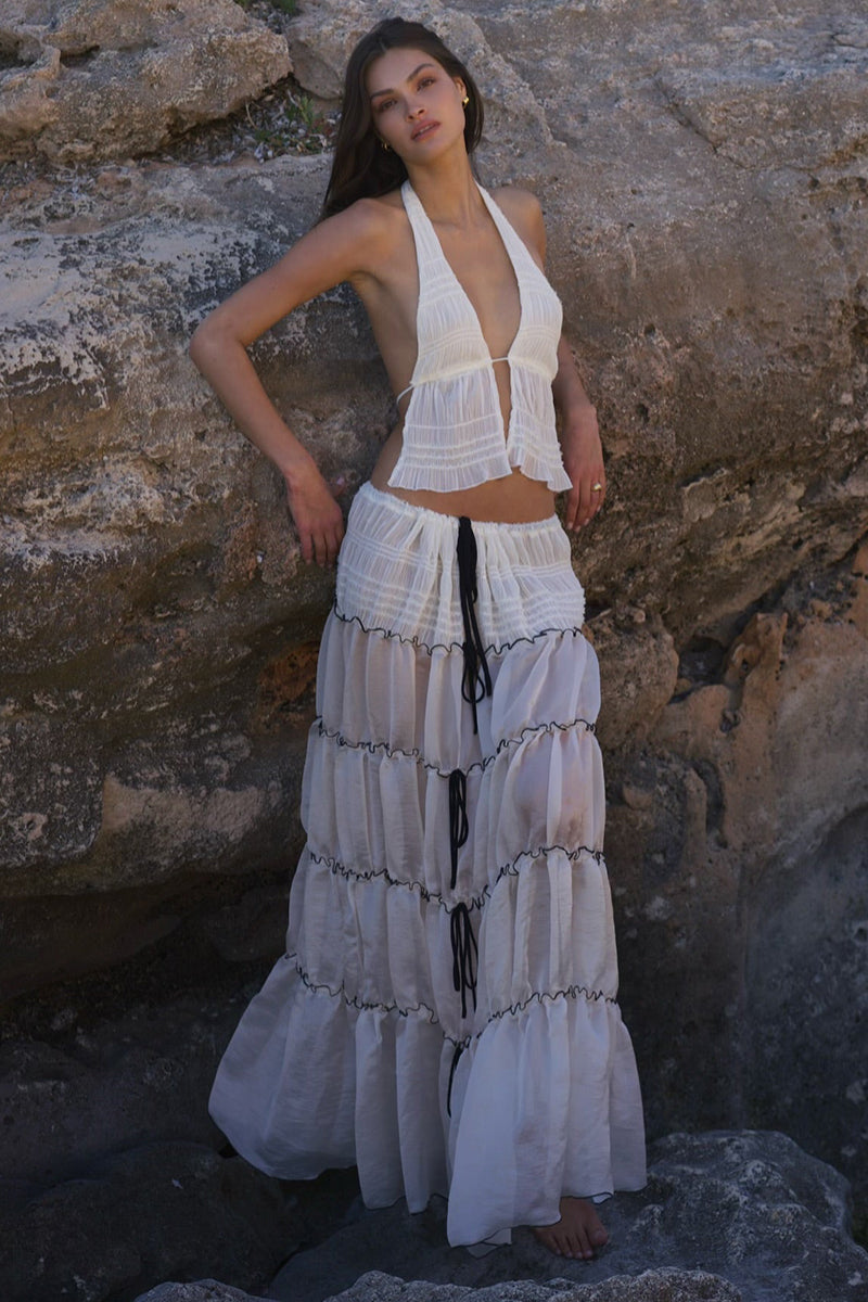 The maxi skirt is designed with a dreamy silhouette. contrast bow details. and subtle sequin ascents at the waist. Pair this ultra-flattering maxi skirt with matching crop top for a show stopping total summer look.
