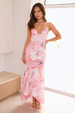 Love at first sight. The Maxi Dress features a patterned design with an elastic back and a gorgeous flowy skirt. Style with heels for a fancy event.
