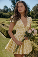 Our pretty prints make us dream of distant destinations. Printed in a vintage floral design. this mini dress has a fitted bodice and softly pleated mini skirt. The skirt is beautifully suspended by way of a frilly tulle underskirt.