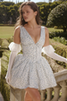 Our mini dress stays true to our love of romantic and feminine designs. This effortless style is cut from a stretch cotton-rich fabric in a pretty bluebell print that's even more gorgeous up close. The plunge neckline perfectly mirrors the open back and the bodice is corseted to cinch the waist.