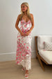 Dreamy asymmetrical patchwork garden and carnation print maxi dress featuring a plunging neckline. fresh white floral lace paneling. and feminine pin-tucked and ruffle detailing throughout. Partially lined. delicate shoulder ties.