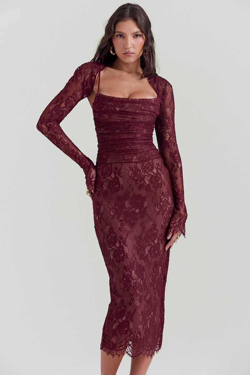 It's easy to fall in love with our gorgeous dress as the delicate lace and beautiful rich colouring make it feel extra special. Made from an exquisite. delicate. scalloped lace in deep Claret. it is underpinned with our figure cinching cafe power mesh in a neutral cafe-au-lait tone. Features a corseted bodice that's gorgeously gathered with lace up detailing to the back.