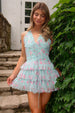 Get summer ready in the mini dress. crafted in pink and blue floral in tulle.