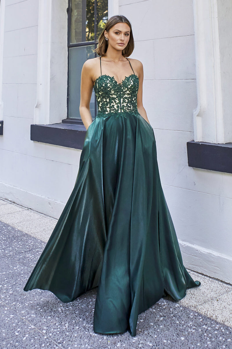 A-Line. sweetheart neckline. metallic satin and lace formal dress