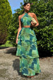 Leaf Print Halter Crop Top Layered Maxi Skirt 2pcs Set-Green