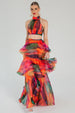 Multi color print. semi high neck halter. sleeveless crop top. layered maxi skirt.