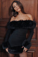 The dress is designed for special occasions. It has an off the shoulder neckline and adorned with luxurious faux fur that's timelessly glamorous. Skimming over your curves for an elegant silhouette. it has long sleeves and a flattering mini cut.