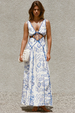 A feminine look for your next event! The Dress with our exclusive shoreline print. It features an open back. tie at centre bust. cutouts at. waist. contrast blue bind panels and trims throughout and a flouncy ankle grazing midi skirt.