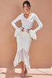 V Neck Ruffle Flare Sleeve Top Fishtail Midi Skirt 2pcs Set-White
